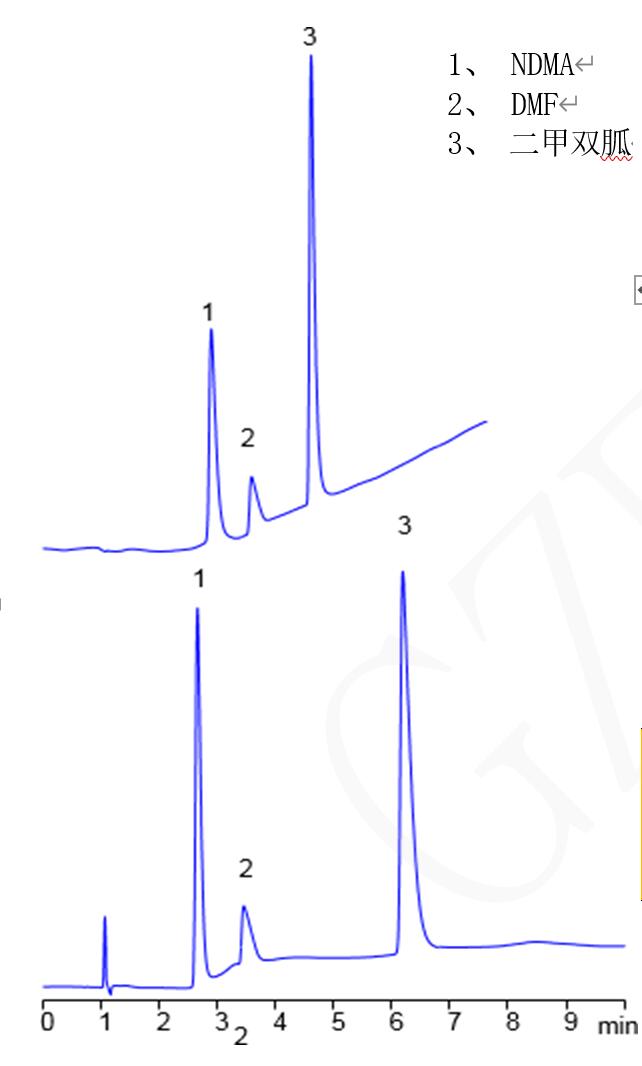 此方法流動相適合 MS 檢測器。很好解決了NDMA 與 DMF 的分離,避免DMF 對 NDMA 實際檢出量的干擾。樣品中的DMF 3mg/ml 濃度是為了在UV 檢測器下可以看 DMF。3u 150*3.0mm 或 3u 150*4.6mm是推薦使用的 MS 檢測器的規格,可以有更大的實際二甲雙胍進樣濃度,且把二甲雙胍的峰拉得更開。