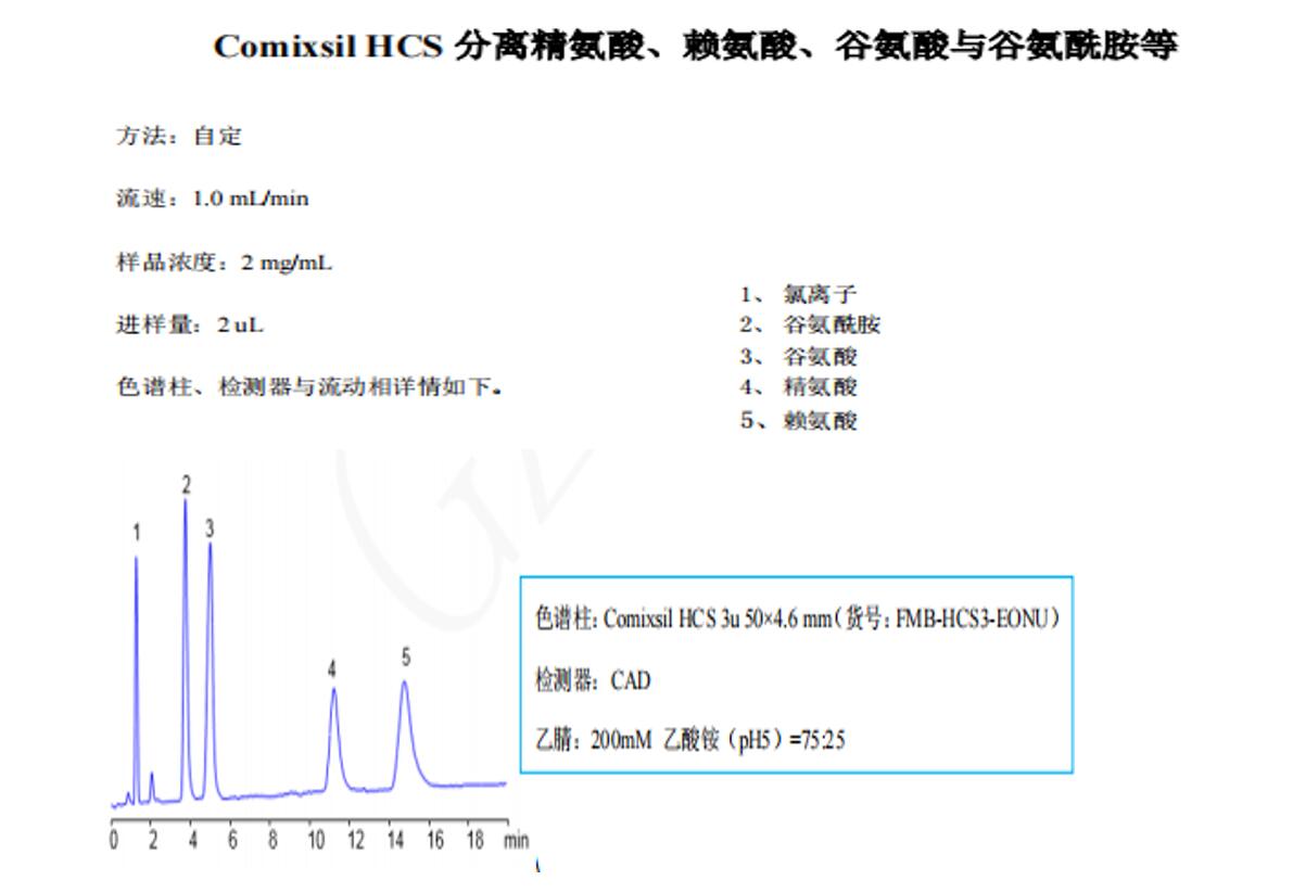 由上面幾個圖可以看到,四個氨基酸他們都有一個氨基的pka在9左右,也就是說ph低于7都有電離,而且他們也都有一個羥基的pka在2左右,所以ph大于4左右也會有電離,所以當(dāng)使用的緩沖鹽的ph等于5時,可以使用陽離子交換和陰離子排斥的作用,同時也可以使用氫鍵的作用作為保留。再根據(jù)他們的親水性不同,將他們分開。