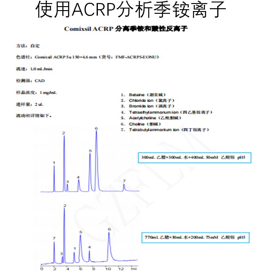 當(dāng)緩沖鹽的PH用到了5,觀察第一個圖譜和條件,四丁基銨離子因為只有一個位點(diǎn)的陰陽離子交換,該流動相條件下幾乎沒有沒有Hilic作用,導(dǎo)致出峰最慢。此PH狀態(tài)下,甜菜堿具有兩個位點(diǎn)的電離,陰陽離子交換比較強(qiáng),所以最先出峰。觀察第二個圖譜和條件,此時的流動相條件下具有Hilic作用,又因為四丁基銨離子是分析物中疏水性最強(qiáng)的,所以最先出峰。