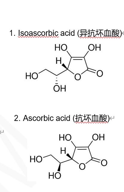 抗壞血酸與異抗壞血酸是一對光學異構體。抗壞血酸是一種營養強化劑,藥用為多。異抗壞血酸,多用于食品與化妝品中,作為防腐劑用。