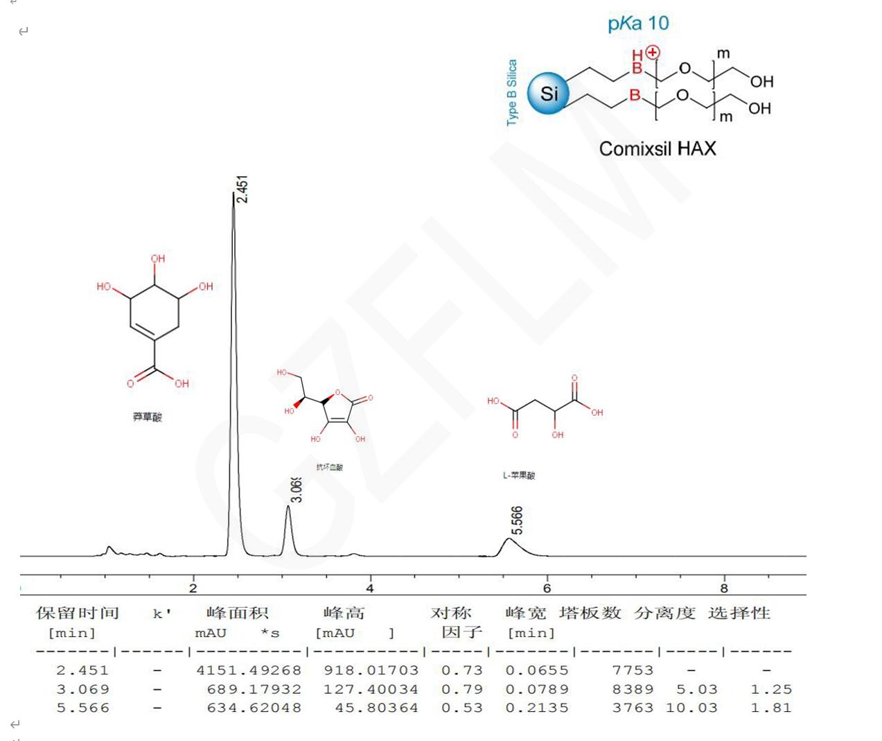 方法說明:使用 Comixsil HAX 是陰離子交換+HILIC 混合模式,對莽草酸、抗壞血酸、蘋果酸三個有機酸進行保留并分離,蘋果酸具有雙羧基結(jié)構(gòu),保留較強。