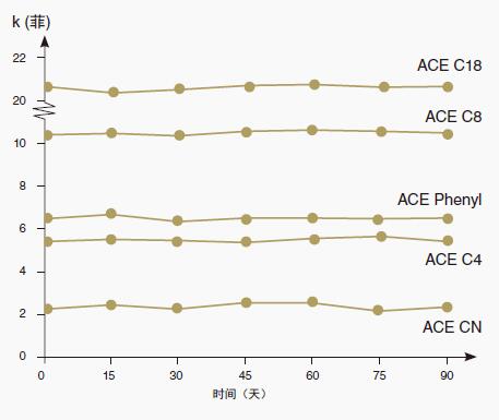 盡管所有ACE鍵合相的穩定性都很優異,但是一些鍵合相并不像其它鍵合相那樣穩定。例如,通常認為C18鍵合比柱長較短的烷基相、PFP相和苯基鍵合相更穩定。