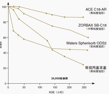 使用設計用于加速柱降解下的條件,ACE C18-AR相顯示保留損失極少,其壽命相當于高度穩定的ACE C18相。兩種固定相均由相同的超純硅膠而制成,而且比Zorbax SB-C18的耐久性更好(Zorbax SB-C18曾視作在高溫和低pH條件下具有極好穩定性的固定相)。