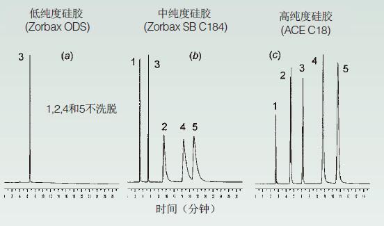 通過(guò)進(jìn)一步改善(提高)硅膠純度(圖1c),可使峰拖尾降低至可接受的水平。