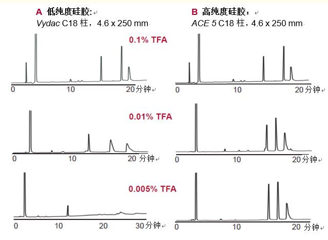 硅膠純度。高效液相色譜柱所用硅膠填料的純度對分離性能至關(guān)重要。金屬離子雜質(zhì)會導(dǎo)致峰拖尾和分辨率下降,如圖7A所示(0.01%和0.005%的TFA)。